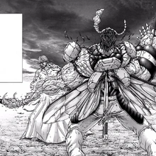 | Second Stage | In his second stage insect form he develops blades on his wrists and heels akin to the hornet's powerful mandibles. They are razor-sharp, being able to cut into even the Tasmanian king crab Terraformars with ease. In his third stage he grows a hornet's wings from his back, enabling him to lift off, although he has not shown the ability of sustained flight. | |